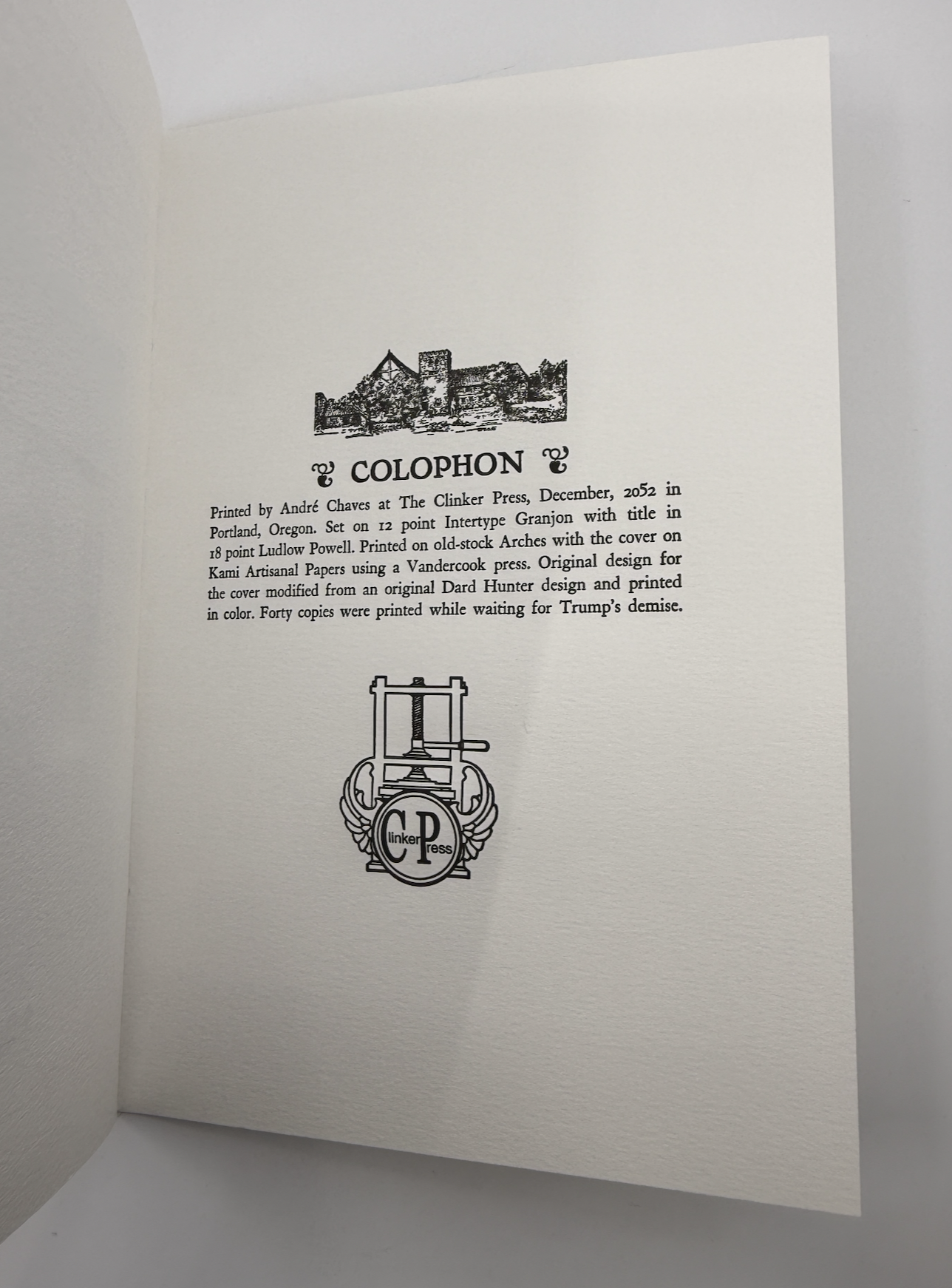 Pamphlet is printed on Arches paper with a handmade paper cover.  The size is 7″ x 10″.